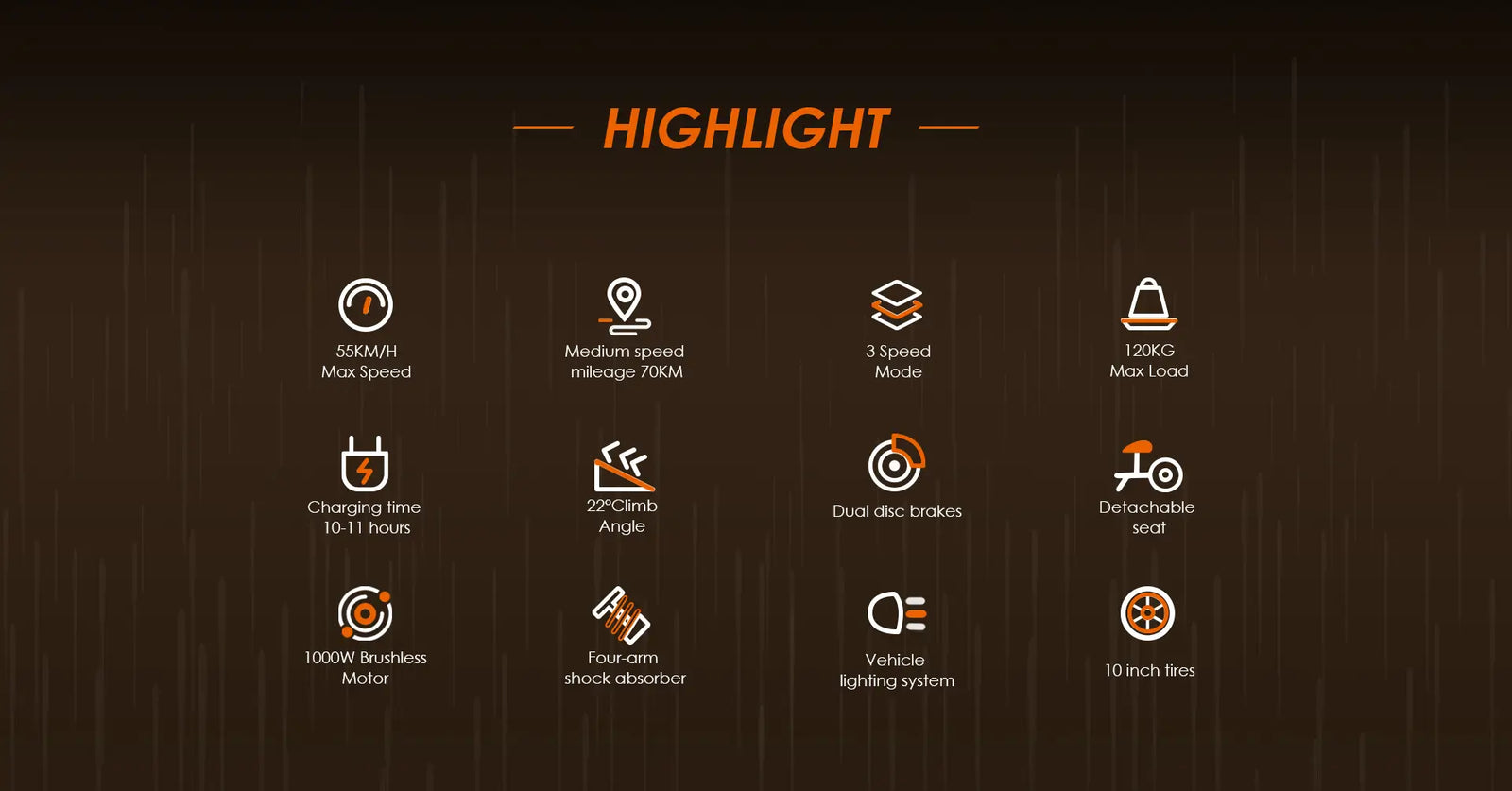 Tire10inLightsLED IntegratedBrakesFront and rear disc brake&e-brakeShock AbsorberSpring shock adsorption