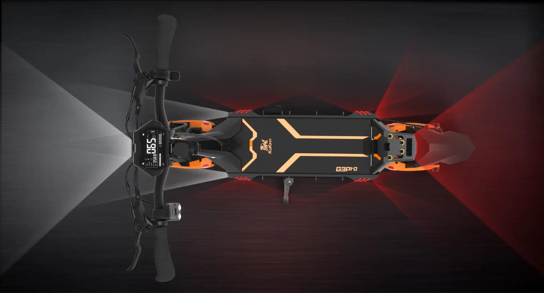 KuKirin G3 Pro adopts three LED lights at the front and rear, two auxiliary lighting turn signals at the front in addition to the main headlights, and two turn warning lights at the rear in addition to the brake lights on the tail, 6 LEDs not only satisfy your nighttime illumination, but also make your nighttime travelling safer, the front and rear brake lights will flash to remind you when you turn, and the taillights will flash to remind you when you brake.