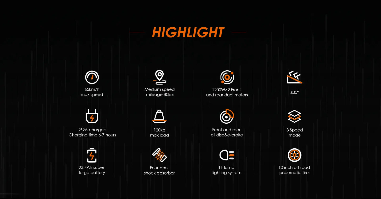 Battery52V 23.4AhCharger58.8V2A 100-240VSpeed ClassLevel 1(25KM/H)