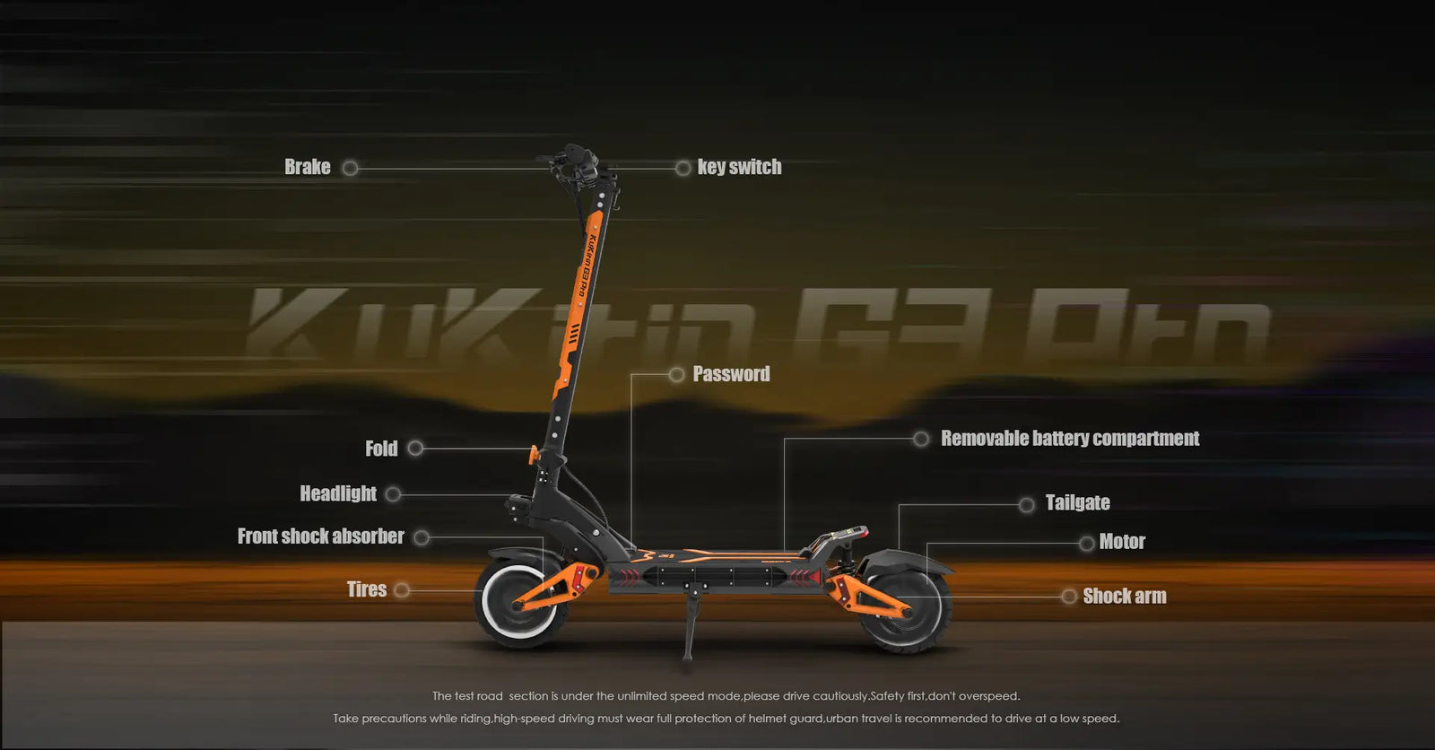 KuKirin G3 Pro adopting skeleton technology design, whether it is the skeleton front beam Shock absorber arm, or fun hollow tail wing has injected new vitality into the scooter, presenting a fresh, elegant temperament.