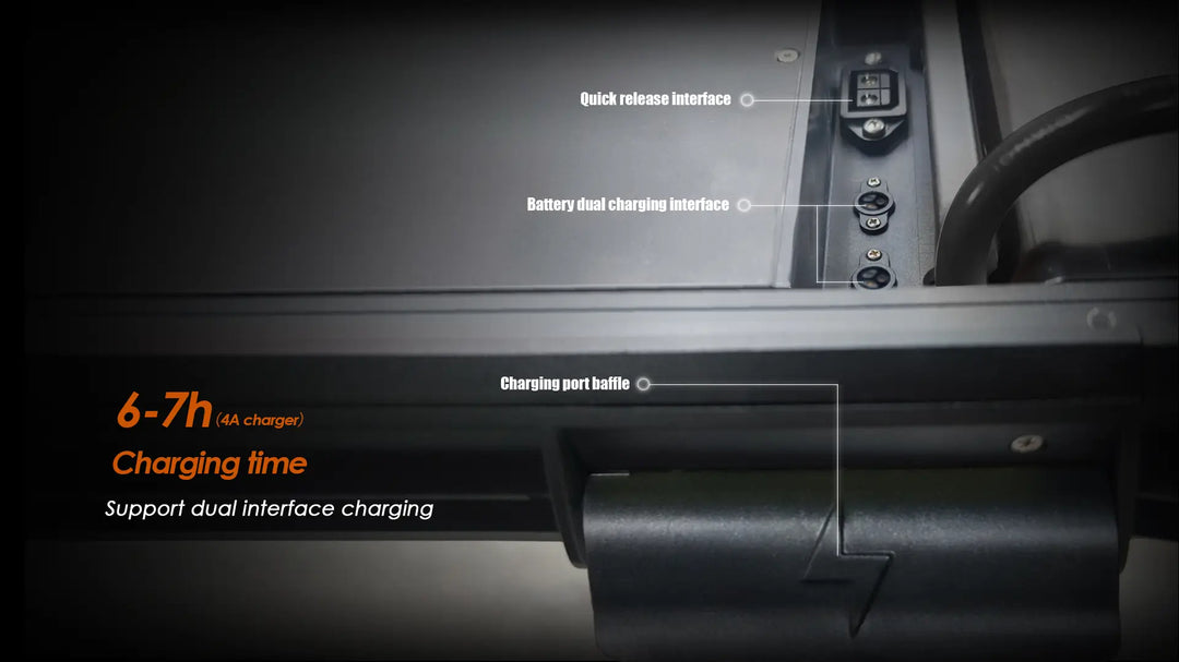 The KuKirin G3 Pro is equipped with two charging ports, allowing for dual charging simultaneously and providing an extremely fast charging experience. When two 2A chargers are used at the same time, the scooter fully charges in just 5 hours. If two 3A chargers are used, the charging time is reduced to 3 hours, and with two 5A chargers, the charging time is further shortened to just 2 hours.