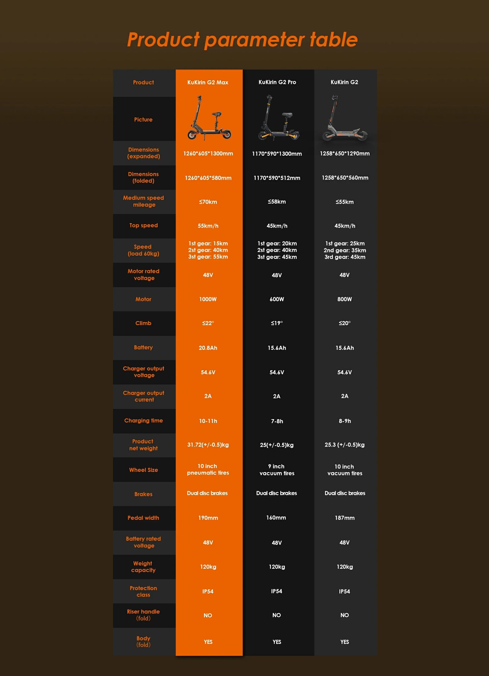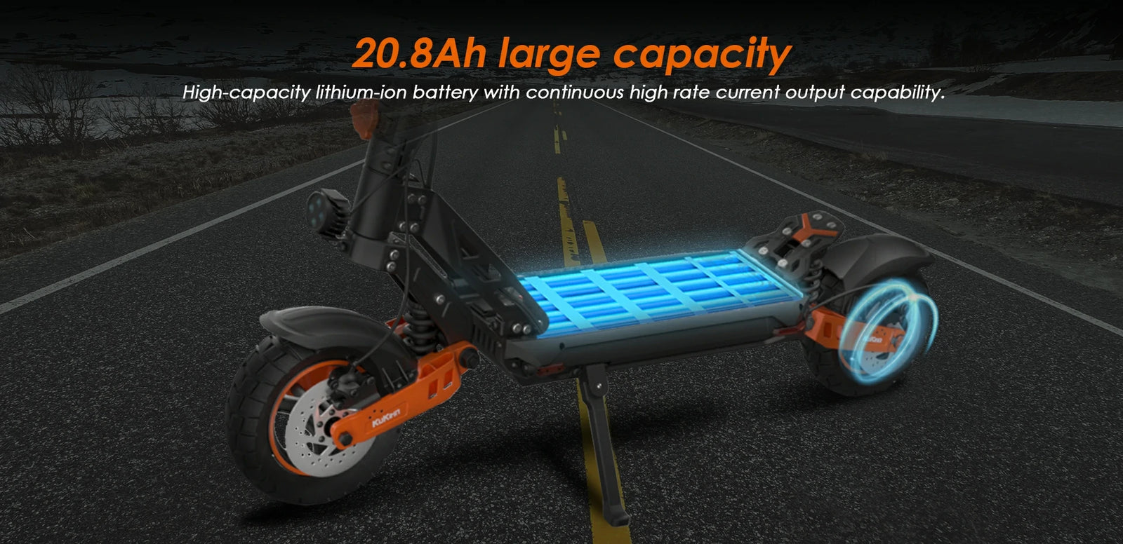 KuKirin G2 Max adopts 48V20.8AH large capacity high quality lithium-ion batteries,continuous high rate current output capacity provides 70km long range, so you no longer worry about the lack of range.