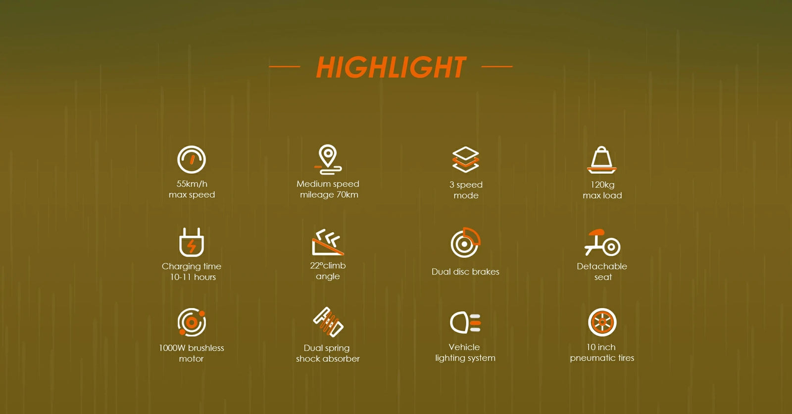 Tire10inLightsLED IntegratedBrakesFront and rear disc brake&e-brakeShock AbsorberSpring shock adsorption