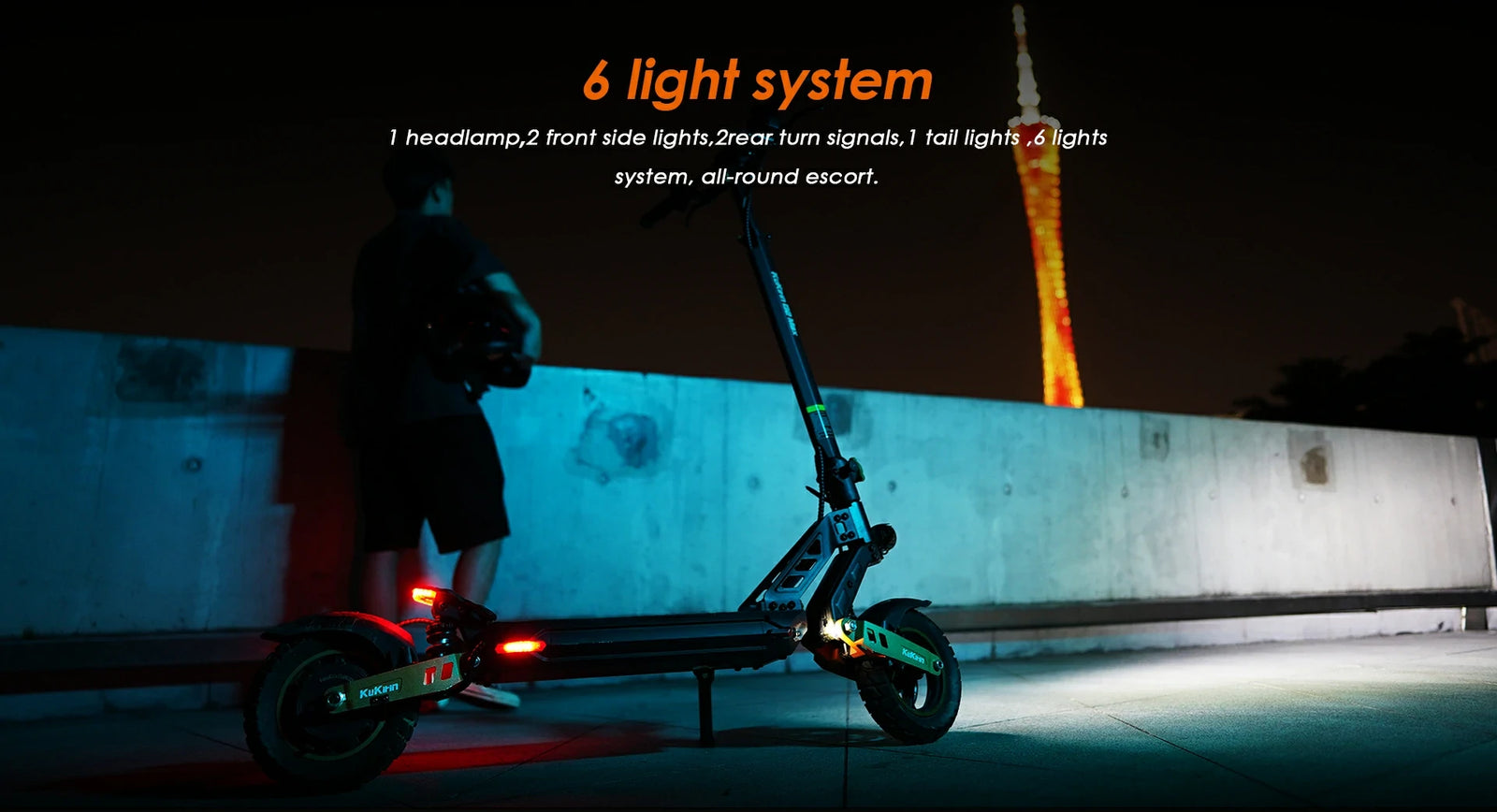 KuKirin G2 Max adopts three LED lights at the front and rear, two auxiliary lighting turn signals at the front in addition to the main headlights, and two turn warning lights at the rear in addition to the brake lights on the tail, 6 LEDs not only satisfy your nighttime driving, but also make your nighttime driving safer, the front and rear brake lights will flash to remind you when you turn, and the tail lights will flash to remind you when you brake.