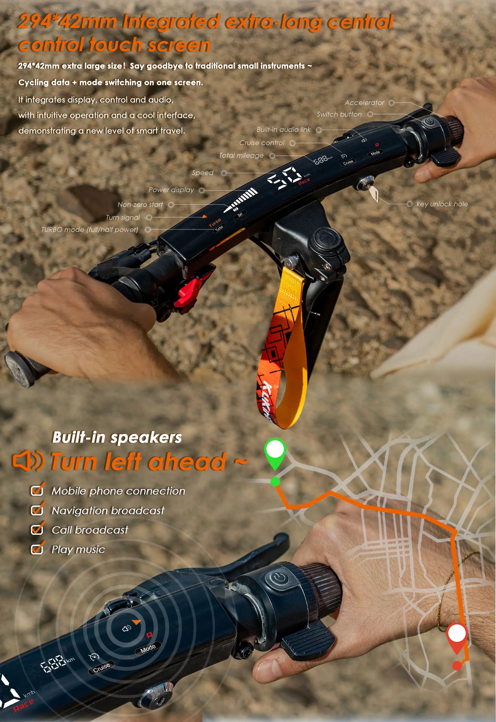 The 294mm x 42mm ultra-wide LED touch display provides clear visibility of speed, battery level, mileage, cruise control, and mode settings. With intuitive touch controls and a sleek interface, it offers a premium user experience and modern aesthetic.