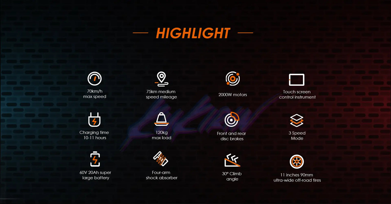 20Ah/1200Wh high-capacity high-performance,high-quality lithium with a maximum battery life of 75KM.While continuously outputting high rate current, it can also provide you with ultra-long battery life guarantee.