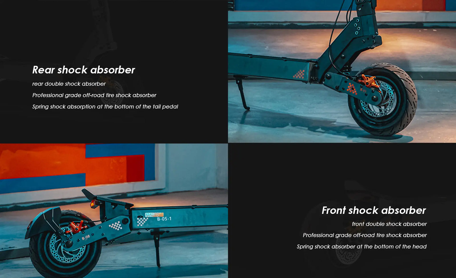 • KuKirin G4 adopts front and rear dual disc brakes,Front and rear 140mm wire-controlled disc brake iscs,ventilation and heat dissipation,no fear of high speed,giving you the confidence to stop when you want to stop.